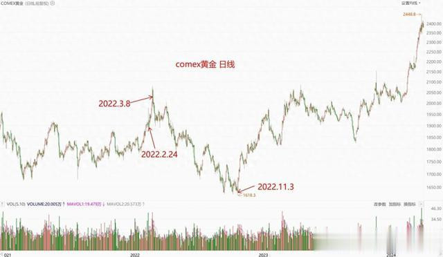 比如,俄乌冲突是2022年2月24日开始的,之后愈演愈烈,但看下图黄金的走势,也就涨了一点点,然后从2022年3月8日开始就一路跌,一直跌到2022年11月3日。